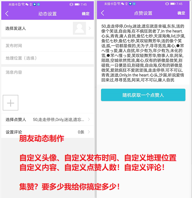 朋友圈动态制作,自定义头像、发布时间、自定义地理位置!集赞要多少能设置多少!