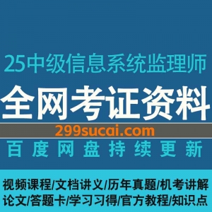 各类最新软考资源课程在网盘群组持续更新中,本套资源收集整理了2025计算机技术与软件专业技术资格考试软考中级信息系统监理师课程资料合集,包含软考中级信息系统监理师网课+PDF教材讲义,百度网盘分享,文件大小共88G,包含软考中级信息系统监理师历年真题/视频课程/机考讲解/知识点…等内容。