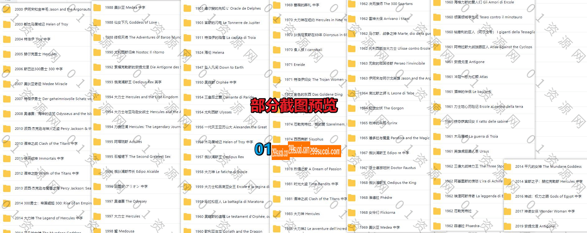 本套资源收集整理了100部由希腊神话改编的经典百佳电影电视剧合集,网盘分享,文件大小共280G,带中文字幕,包含尤利西斯/木马屠城记/特洛伊的陷落/宙斯的闪电…等著名影片。