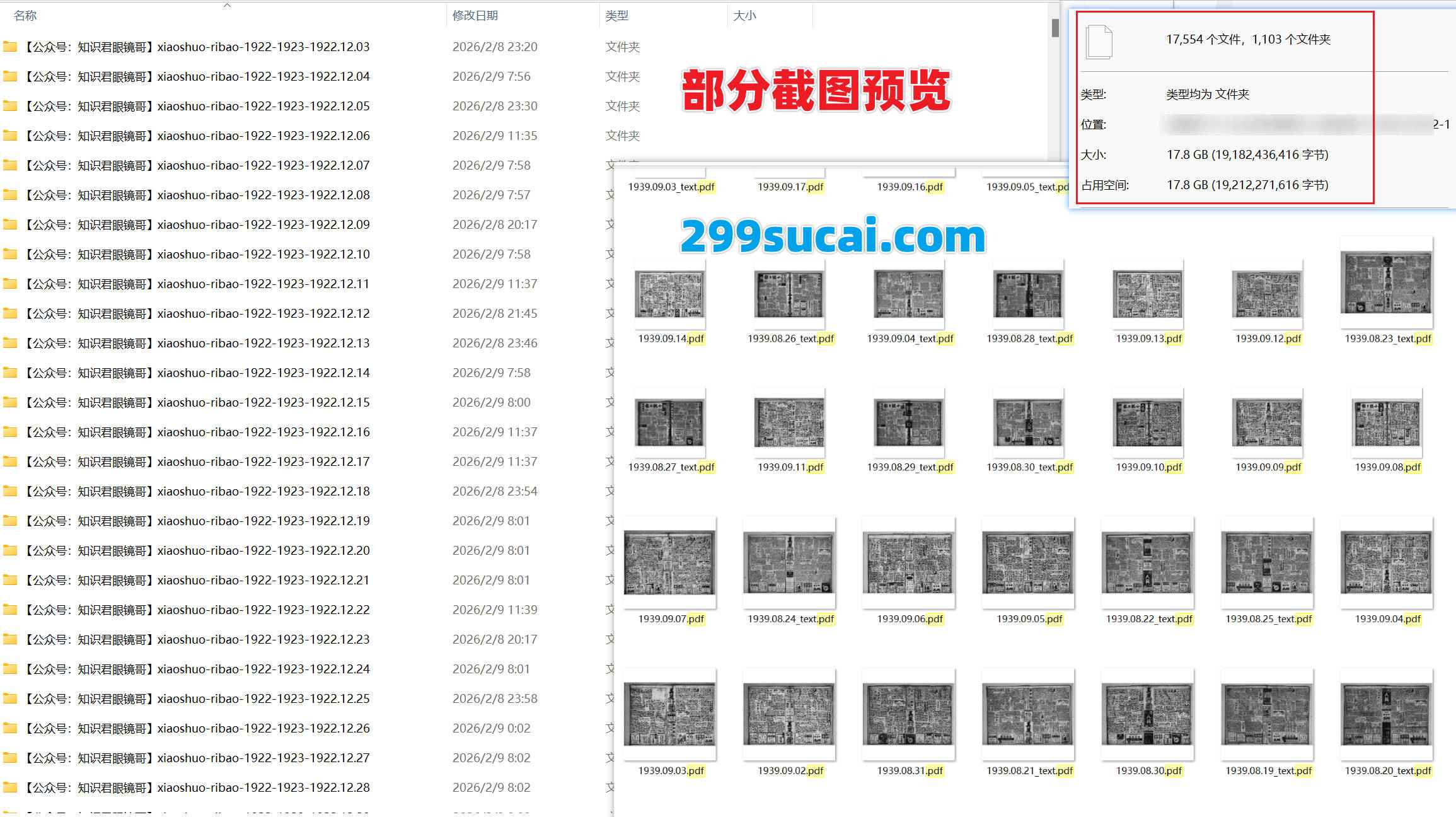 本套资源收集整理了历年老报纸/小说日报PDF电子版合集,涵盖1922年-1941年历年小说日报电子版合集,网盘分享,文件大小共17.8G,共1100多份。
