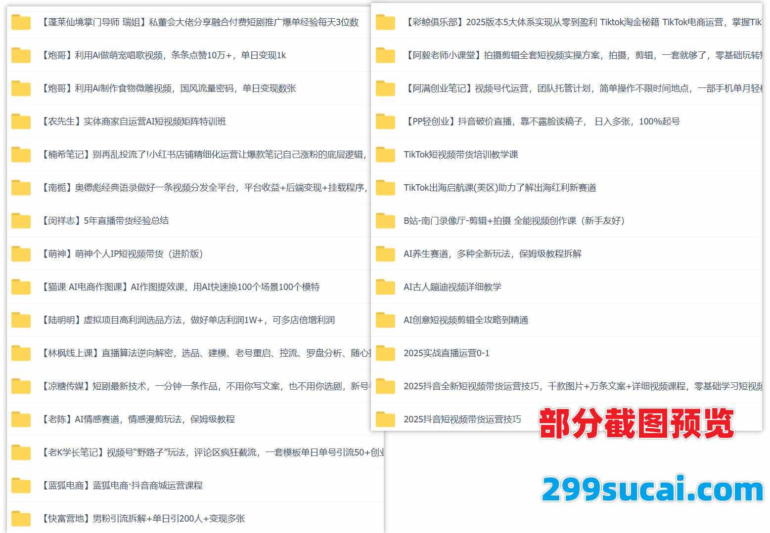本文对2025年4月299素材网百度网盘群组更新的各类最新互联网赚钱实操视频课程进行了合集汇总,累积新增130套+课程,均为百度网盘分享,文件大小共336G,包含小红书课程/淘宝课程/抖音课程/电商课程/deepseek课程/职场课程/亚马逊跨境外贸课程/闲鱼课程/短视频自媒体课程/网赚课程/副业课程/文案写作课程/AI课程/人工智能课程/chatgpt课程……等各类最新网赚课程,涵盖包含猫课/蓝狐电商/彩鲸俱乐部/一秋船长/闵祥志/萌神…等博主课程。